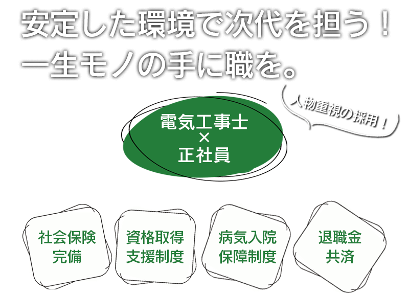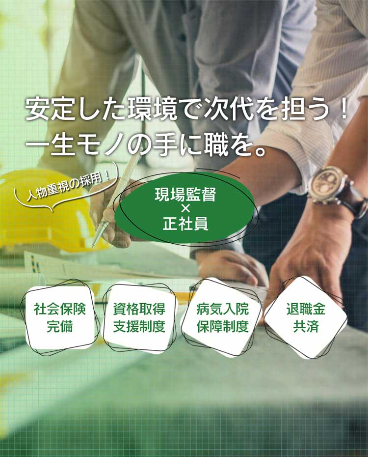 この度事業拡大に伴い、次代を担うスタッフを募集します。先輩社員と若手社員の仲が良く、風通しの良い職場です。経験者、有資格者の方はもちろん、人物重視の採用なので未経験者でもやる気と向上心があればOK!入社後に資格取得支援制度を利用してスキルアップできます!