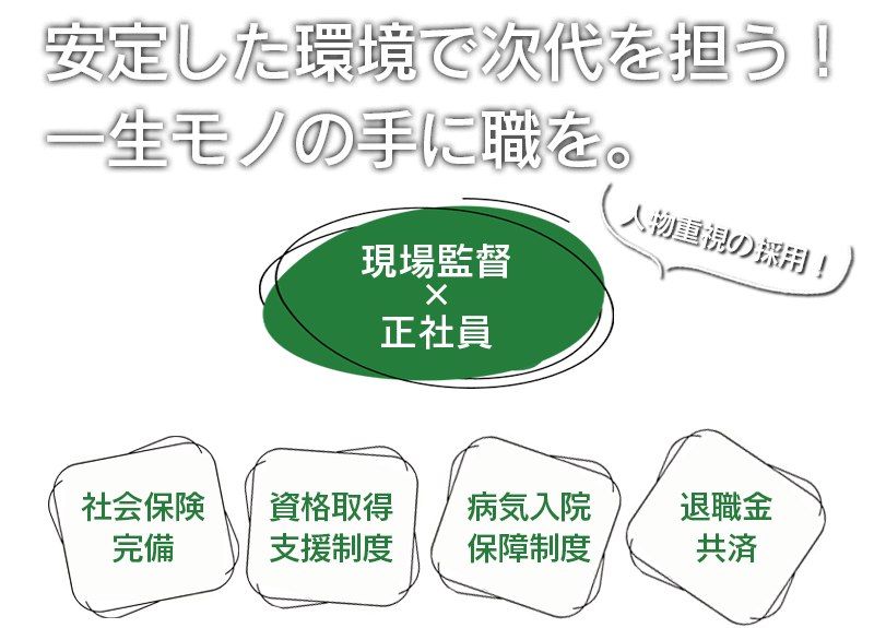 この度事業拡大に伴い、次代を担うスタッフを募集します。先輩社員と若手社員の仲が良く、風通しの良い職場です。経験者、有資格者の方はもちろん、人物重視の採用なので未経験者でもやる気と向上心があればOK!入社後に資格取得支援制度を利用してスキルアップできます!